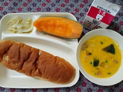 ☆給食室からこんにちは☆ 6月3日(金)〜かぼちゃのクリームシチュー、キャベツのゆずドレッシング、クインシーメロン、おさつパン、牛乳〜