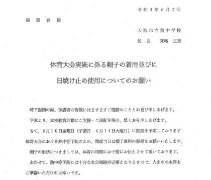 体育大会実施に係る帽子並びに日焼け止め使用についてのお願い