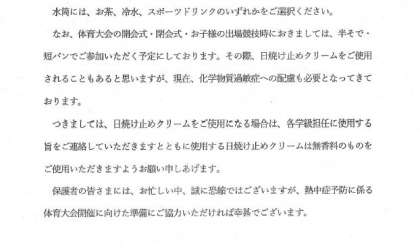 〇体育大会実施に係る帽子並びに日焼け止め使用についてのお願い