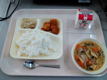 本日は、中華煮、あつあげのピリ辛じょうゆかけ、もやしの中華あえ、ごはん、牛乳でした。いっぱい食べてくれています。ありがとうございます。