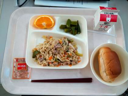 本日の給食は、和風焼きそば、オクラの甘酢あえ、オレンジ、黒糖パン、牛乳でした。