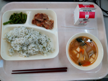 鶏肉のしょうゆバター焼き、とうふのみそ汁、三度豆のごまあえ、菜飯、牛乳でした。