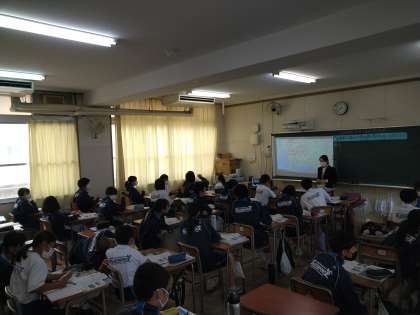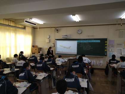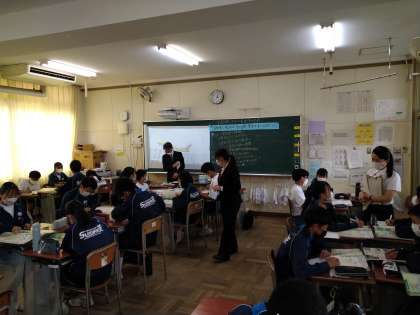 教育実習も今週で終わりを迎えます。今週は、実習生の研究授業が行われます。まず、1番手として、2年生の社会科の実習生が研究授業を行いました。地理の愛知県の学習をしました。パワーポイントを使い、丁寧に授業が展開されていました。また、グループ活動も行われていました。活発な授業の印象がありました。