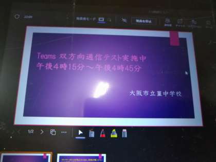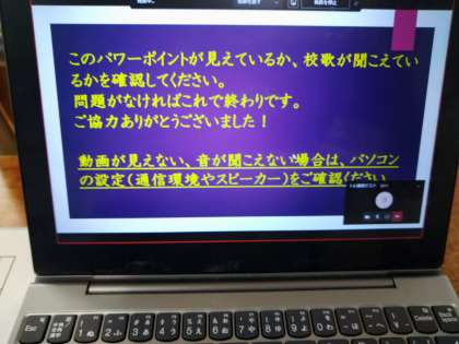 本日の放課後4:15〜4:45の間、一人一台端末の接続テストを行いました。音、映像が流れるかを確認しました。何か不都合があれば、明日、担任(副担任)の先生に連絡をお願いいたします。ご協力、ありがとうございました。