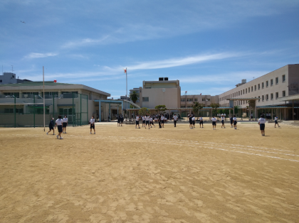 赤(3年)、青(2年)、緑(1年)のボールが飛び交っていました。水分をしっかりと摂って、5限目に備えてください。