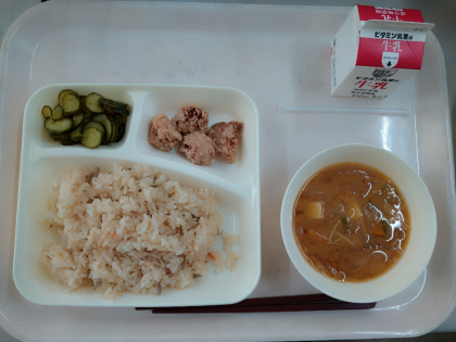 今日の献立は、豚肉のたつたあげ、みそ汁、きゅうりの甘酢づけ、かやくご飯、牛乳でした。今日も給食ありがとうございました!