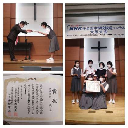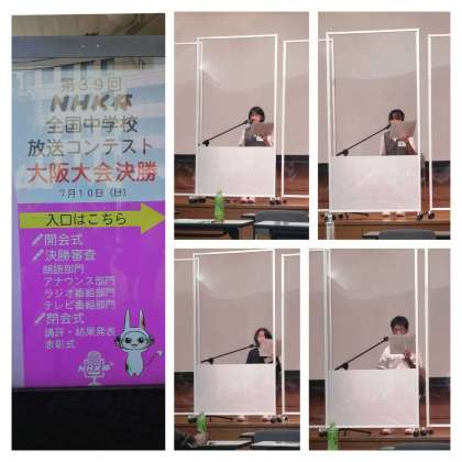 7月10日(日)、NHK全国中学校放送大会の大阪大会決勝が、桃山学院中学校にて行われました。本校からは朗読部門2名、アナウンス部門3名が決勝に進みました。審査の結果、朗読部門で優良賞をいただき、全国に駒を進めることが出来ました。