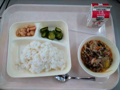 本日の給食メニューは、牛丼、きゅうりのしょうがづけ、大福豆の煮もの、牛乳でした。