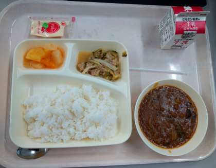 本日のメニューは、夏野菜のキーマカレーライス、ゴーヤとツナのマヨネーズ風味、ミックスフルーツ(缶)、牛乳です。