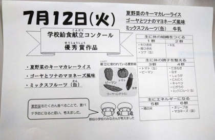 今日は、学校給食献立コンクール優秀賞作品の給食でした。野田小学校のみなさんが考えてくれました。夏野菜をたくさん食べることで、夏バテ予防になると思い、考えてくれました。とても美味しかったです。「ごちそうさまでした。」