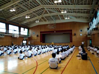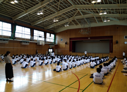 1年生の学年集会は、体育館で行いました。初めての中学校での夏休みを迎えます。対面で、学習面や生活指導面、健康面等々のお話がありました。