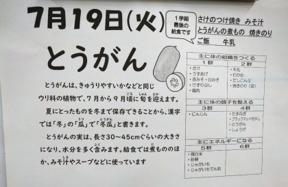 とうがんの実は、長さ30〜45cmぐらいの大きさになり、水分を多く含みます。給食では煮もののほか、みそ汁やスープなどに使っています。