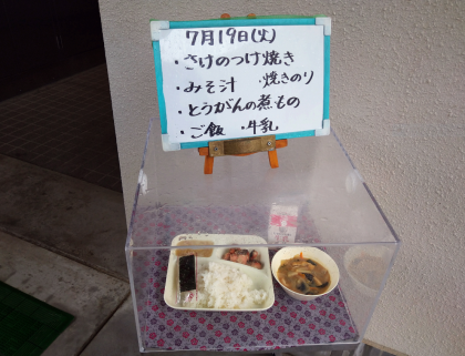 本日は、さけのつけ焼き、みそ汁、とうがんの煮もの、焼きのり、ご飯、牛乳でした。