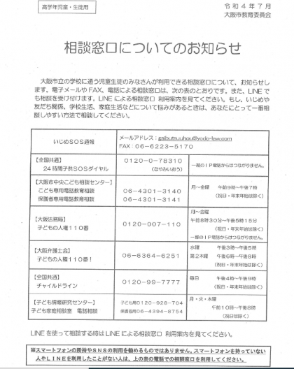 大阪市立の学校に通う生徒のみなさんが利用できる相談窓口について、お知らせいたします。