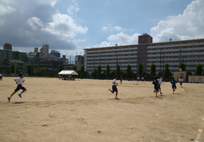 グラウンドでは、陸上部が元気いっぱいに走っている姿が見られました。今日は、グラウンド全面を使っての練習です!