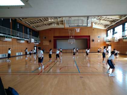 体育館では、女子バスケットボール部がパスの練習をしていました。