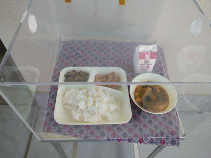 本日の給食メニューは、鶏肉の照り焼き、みそ汁、なすのそぽろ炒め、ごはん、牛乳でした。