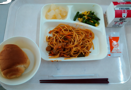 本日のメニューは、イタリアンスパゲッティ、グリーンアスパラガスのサラダ(ノンエッグドレッシング)、和なし(カット缶)、黒糖パン(小)、牛乳でした。