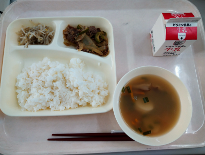 本日のメニューは、プルコギ、トック、もやしの甘酢あえ、ごはん、牛乳でした。