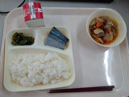 本日のメニューは、さごしの塩焼き、豚肉とじゃがいもの煮もの、オクラのいためもの、ごはん、牛乳でした。