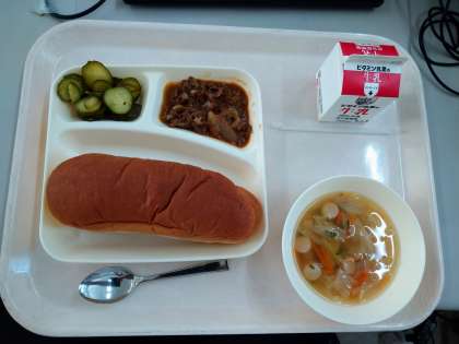 本日のメニューは、牛肉のデミグラスソース煮、スープ、きゅうりのピクルス、黒糖パン、牛乳でした。