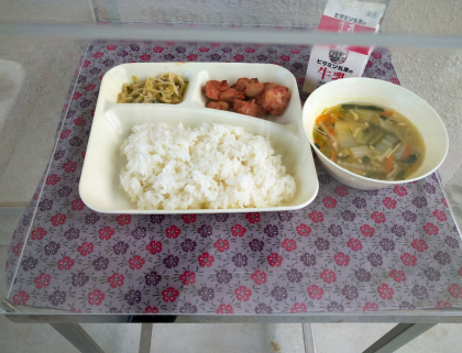 今日の給食は、鶏肉のチリソース焼き、焼き豚とワンタンの皮のスープ、切り干しだいこんのごま辛みづけ、ごはん、牛乳でした。