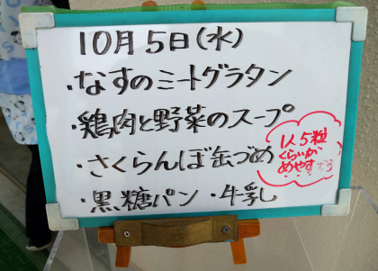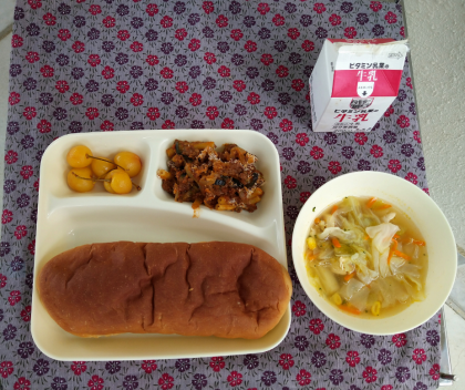 本日のメニューは、なすのミートグラタン、鶏肉と野菜のスープ、さくらんぼ(缶)、黒糖パン、牛乳でした。
