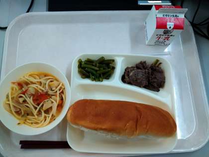 牛肉の香味焼き、ほたて貝とトマトのスープスパゲッティ、三度豆のサラダ、コッペパン、ソフトマーガリン、牛乳でした。