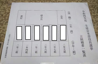 会長・書記は信任投票となります。副会長は、各学年1名ずつとなりますので、投票により決定となります。多くのみなさんが立候補をしてくれました。ありがとうございます。