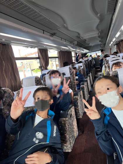 バスに乗車しました。出発して、学校へ戻ります。予定通りの帰校となります。