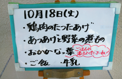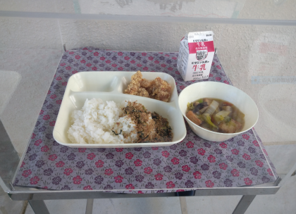 本日の給食のメニューは、鶏肉のたつたあげ、あつあげと野菜の煮物、おかかなっ葉、ごはん、牛乳でした。