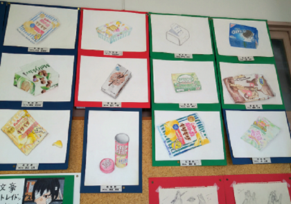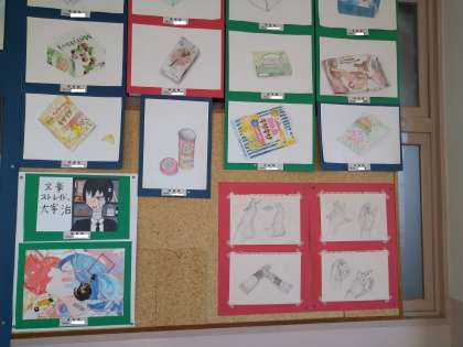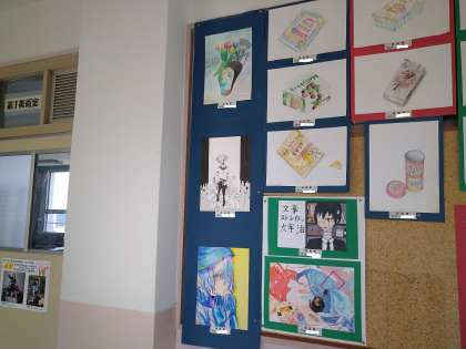 美術室の前に美術部の作品が展示されています。素晴らしい作品ですね。こんな素敵な絵が描けると嬉しいですね。