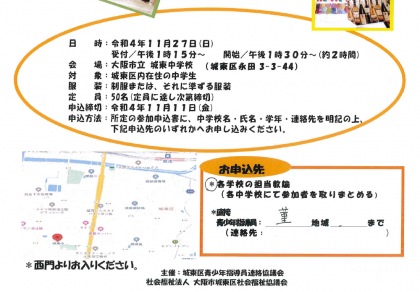 城東区青少年指導員連絡協議会が主催の中学生講習会が行われます。