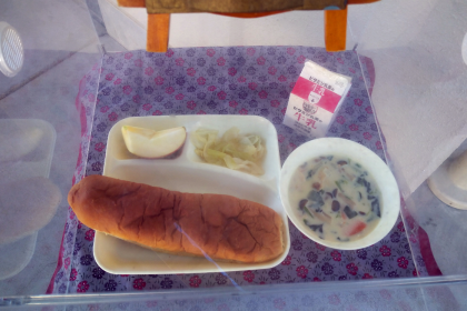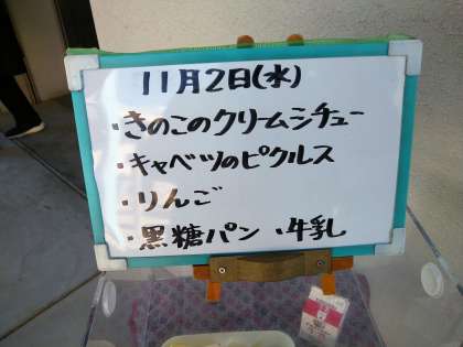 本日の給食のメニューは、きのこのクリームシチュー、キャベツのピクルス、りんご、黒糖コッペパン、牛乳でした。