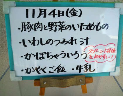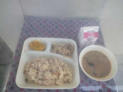 本日の給食のメニューは、豚肉と野菜のいためもの、いわしのつみれ汁、かぼちゃういろう、かやくご飯、牛乳でした。