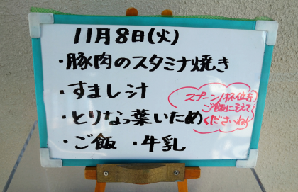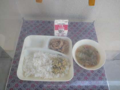 今日の給食は、豚肉のスタミナ焼き、すまし汁、鶏なっ葉いため、ご飯、牛乳でした。