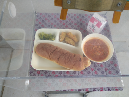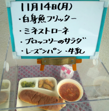 本日の給食のメニューは、白身魚フリッター、ミネストローネ、ブロッコリーのサラダ、レーズンパン、牛乳でした。