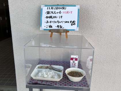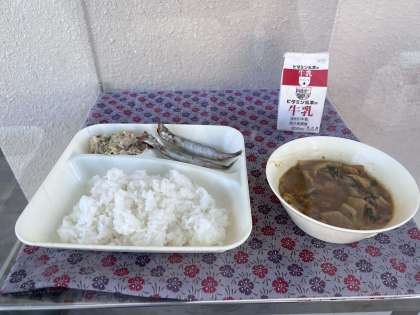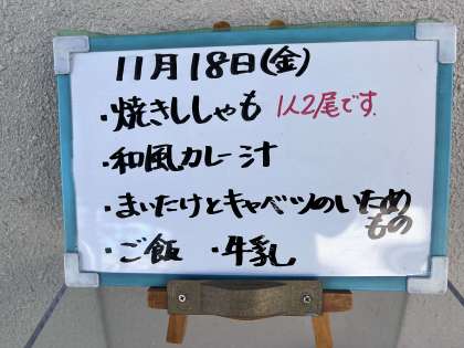 今日のメニューは、焼きししゃも、和風カレー汁、まいたけとキャベツのいためもの、ご飯、牛乳でした。