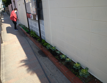 朝から地域ボランティアの花フレンズの方が、お花の水やりに来校してくださいました。毎日のお花のお手入れ、ありがとうございます。