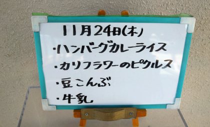 本日の給食のメニューは、ハンバーグカレーライス、カリフラワーのピクルス、豆こんぶ、牛乳でした。