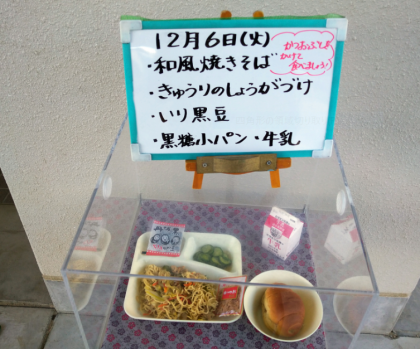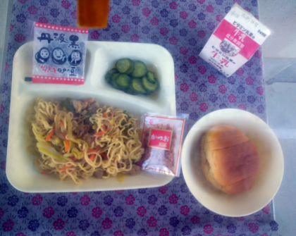本日の給食メニューは、和風焼きそば、きゅうりのしょうがづけ、いり黒豆、黒糖パン(小)、牛乳でした。