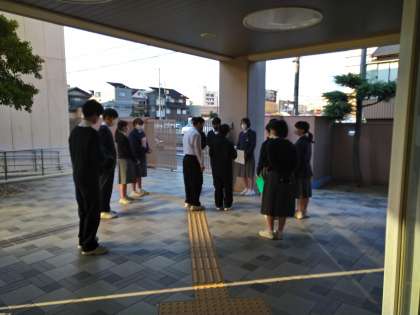 写真は、風紀委員の登校あいさつ後の打ち合わせの様子です。