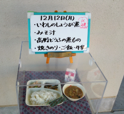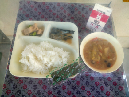 今日の給食は、いわしのしょうが煮、みそ汁、高野どうふの煮もの、やきのり、ごはん、牛乳でした。