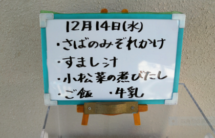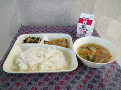 今日の給食は、さばのみぞれかけ、すまし汁、小松菜の煮びたし、ごはん、牛乳でした。