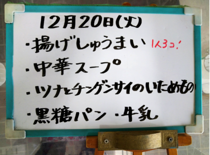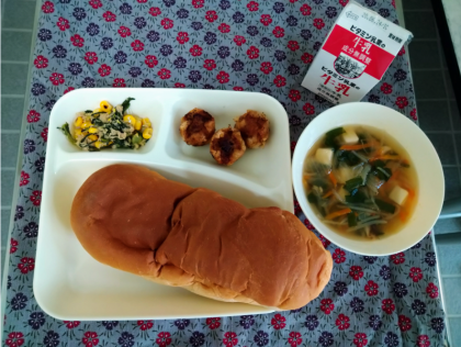 今日の給食のメニューは、揚げシューマイ、中華スープ、ツナとチンゲンサイのいためもの、黒糖パン、牛乳でした。美味しくいただきました。「ごちそうさまでした。」