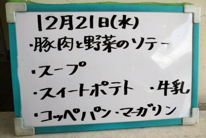 今日の給食メニューは、豚肉と野菜のソテー、スープ、スイートポテト、コッペパン、ソフトマーガリン、牛乳でした。