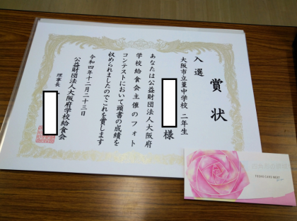 学校給食会主催のフォトコンテストにおいて、優秀な成績を収められました!受賞の様子です。おめでとうございます!!