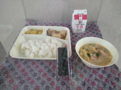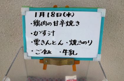 本日の給食のメニューは、鶏肉の甘辛焼き、かす汁、栗きんとん、焼きのり、ごはん、牛乳でした。
