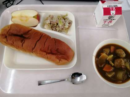 本日の給食メニューは、ミートボールと野菜のカレー煮、ツナとキャベツのソテー、りんご、黒糖パン、牛乳でした。