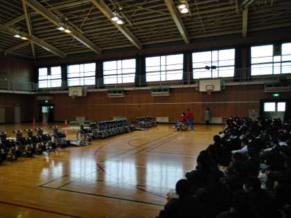 本日、1年生は人権学習として、車いす体験に取り組んでいます。みんな真剣にお話を聞いています。貴重な体験ですね。